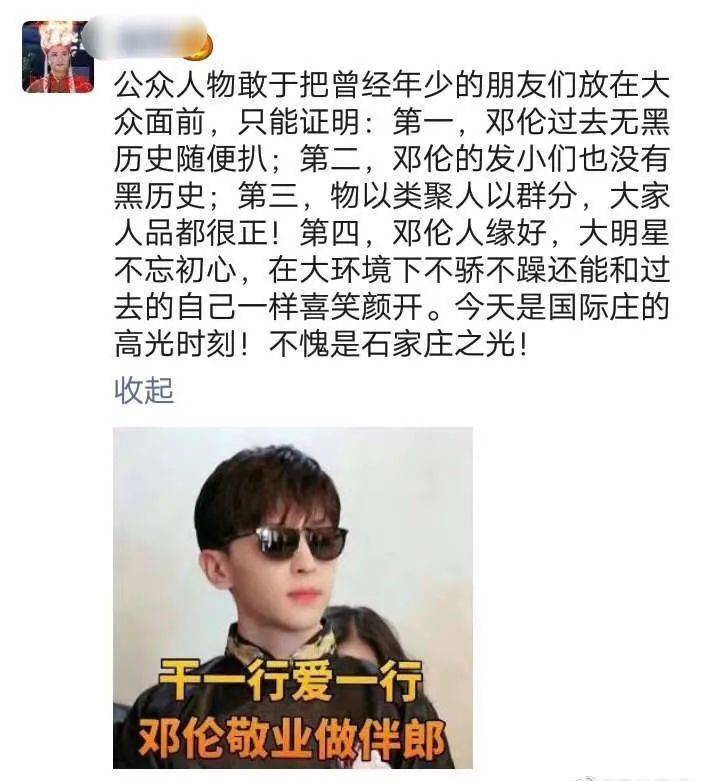 因为熟悉这位“石家庄之光”的粉丝儿应该知道,他们有个小团体叫“石家庄十一子”,就是包括邓伦在内十一个关系很好从小玩到大的朋友。