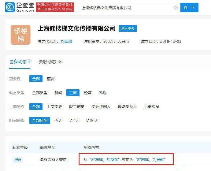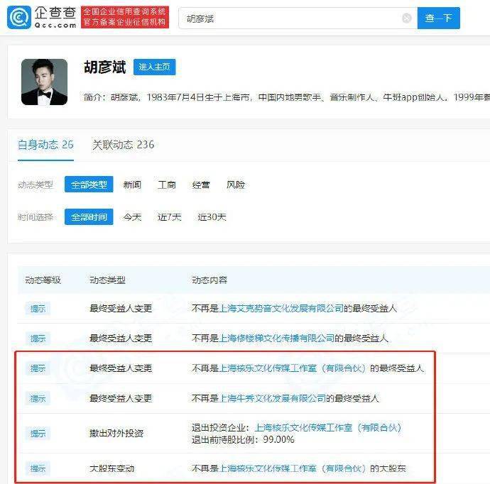 据企查查,胡彦斌于近期不再担任上海核乐文化传媒工作室(有限合伙)、上海修楼梯文化传播有限公司、上海牛秀文化发展有限公司最终受益人,相关公司的最终受益人从“罗志祥、胡彦斌”变更为了“罗志祥、刘嘉懿”。