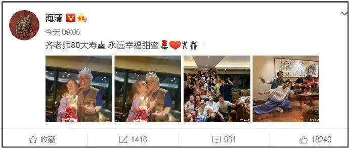 8月31日,海清在社交平台晒出为北电教授齐士龙庆祝80岁大寿照片。照片中,97级表演系的师生们齐聚一堂,海清、黄磊都到场祝贺,还摆出搞怪pose。黄海波也久违露面,穿着朴素的他对着镜头比耶,看起来状态不错。据悉,海清和黄海波是北电97级的同班同学,黄磊是他们的班主任。