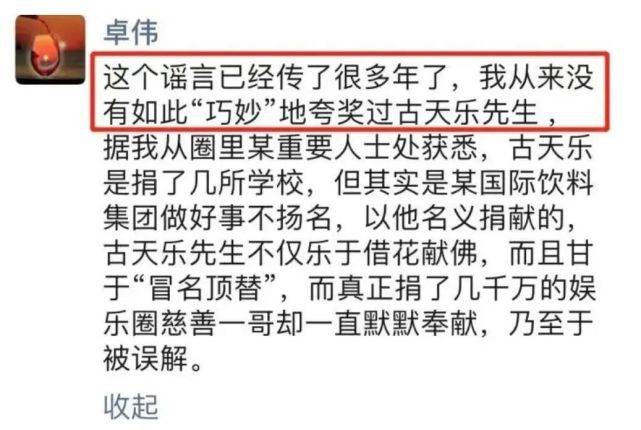 随后卓伟就在微信朋友圈辟谣自己没说过这句话,还说古天乐在做“假慈善”,而古天乐只捐过几所学校还是别的公司以他的名义捐赠的。