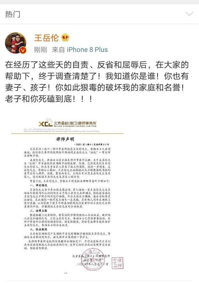 果不其然,近日导演王岳伦发文“在经历了这些天的自责、反省和屈辱后,在大家的帮助下,终于调查清楚了!我知道你是谁!你也有妻子、孩子!你如此狠毒的破坏我的家庭和名誉!老子和你死磕到底!”看来王导真的生气了。