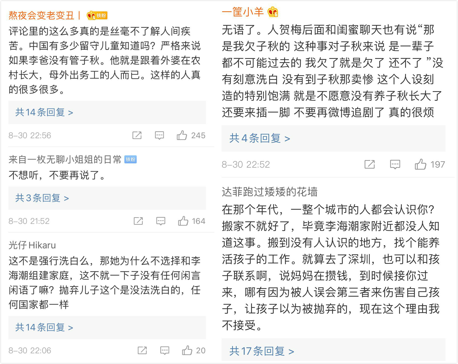 至于为什么后来的这么多年不来找子秋,贺梅主要的考虑是,子秋是李海潮一手 养大的,自己不能中途“夺人所爱”。这样看来,贺梅挺有苦衷的。
